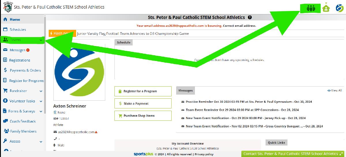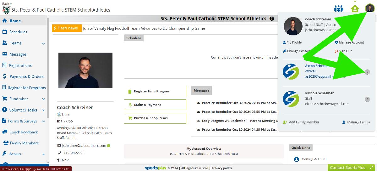 3. From your MEMBER PORTAL, select the SportsPlus icon, or your picture, in the upper righthand corner. Then select the arrow next to the child that you are updating availability for.