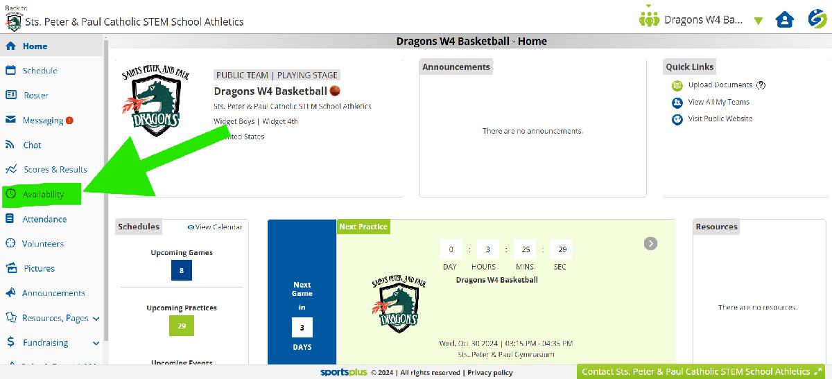 5. You are now in your child’s TEAM PORTAL under your child’s account. Click on ‘Availability’ in the menu to the left.